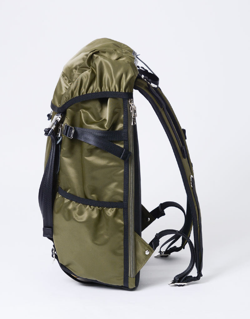 This series is characterized by its elegant sheen from the ultra high-density nylon twill, combined with military-inspired details highlighted by metal parts.