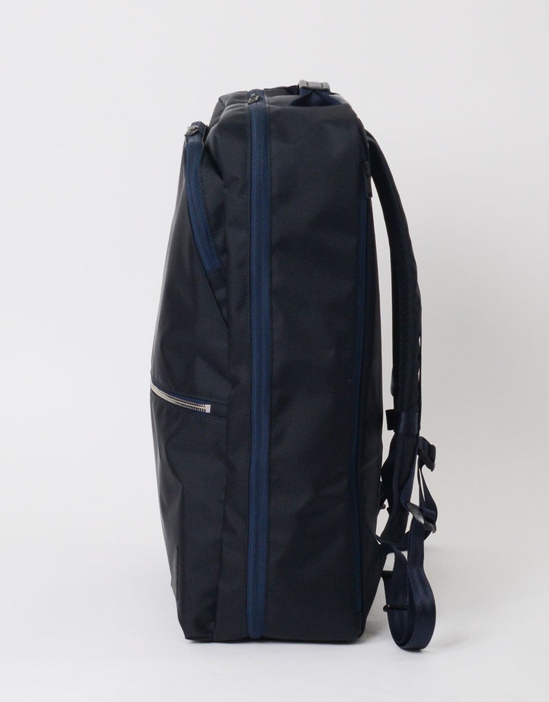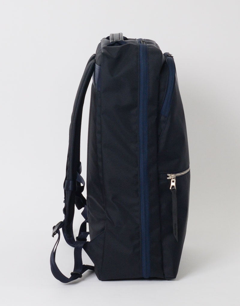 The body fabric is made from Yorofu庐, an ultra-strong nylon fabric created using Toray's cutting-edge technology. Unlike conventional 66 nylon, this fabric uses the world's highest level of high-strength nylon thread, using high-viscosity polymer technology and spinning technology. Furthermore, we use a material that is stronger and more durable than conventional 66 nylon, and is a combination of purely domestic technology. The surface of this Armor Cloth庐 420D nylon is treated with a durable super water-repellent finish, and the back side is coated with three different layers to make it lightweight and waterproof. The attached fabric is INVISTA's 1680D Cordura Ballistic庐 nylon, which has approximately 5 times the wear and tear strength and durability of regular nylon, and the back side is PVC treated to further improve strength and waterproofness. I am. In addition, the included leather is eco-nume cow leather that has been tested for hazardous substances (JES) according to the 13 standards of the Japan Leather Technology Association and is tanned with vegetable tannin without using any hexavalent chromium, a substance that is harmful to the human body. doing. The front pocket zipper uses YKK EXCELLA, each element of which has been carefully polished, and other parts are made from as little metal as possible to reduce weight. The triangular name has a retroreflective function and is designed for safety at night. There is space to store laptops, tablets, etc. With its simple design and color, this series is suitable for a variety of situations, whether it's on or off.