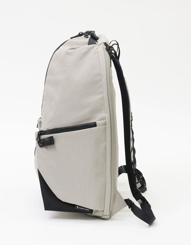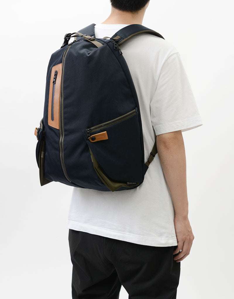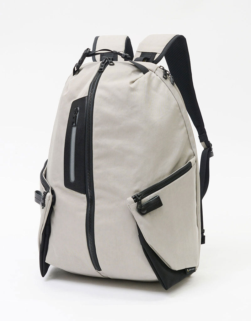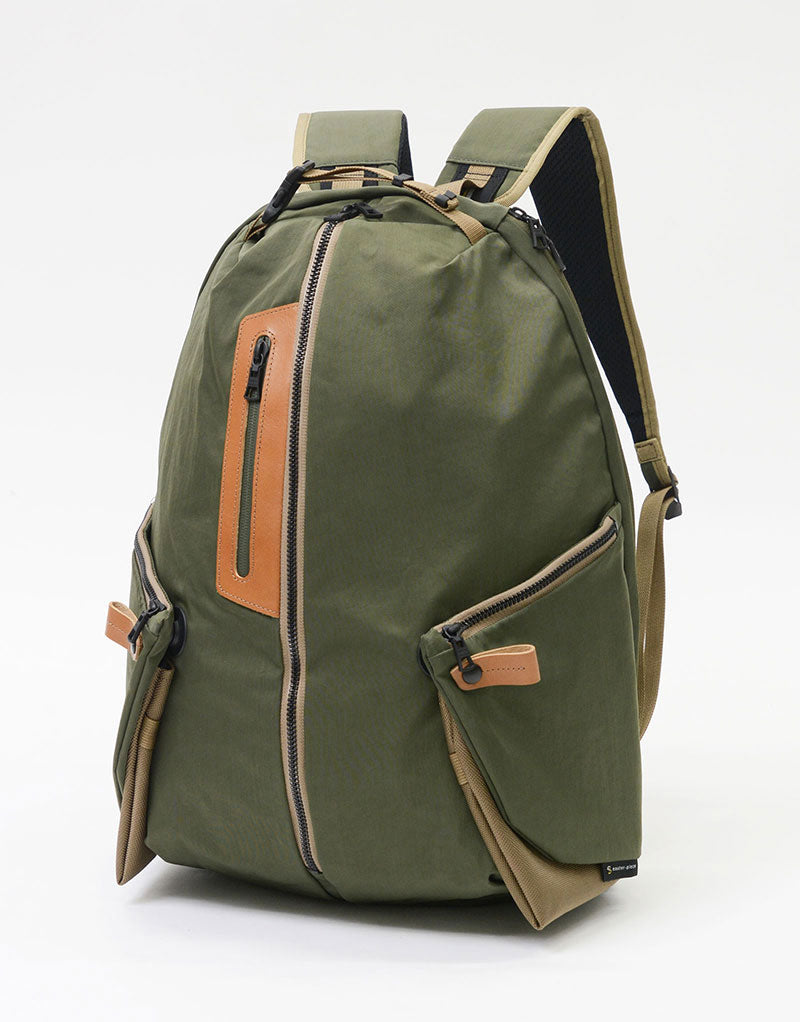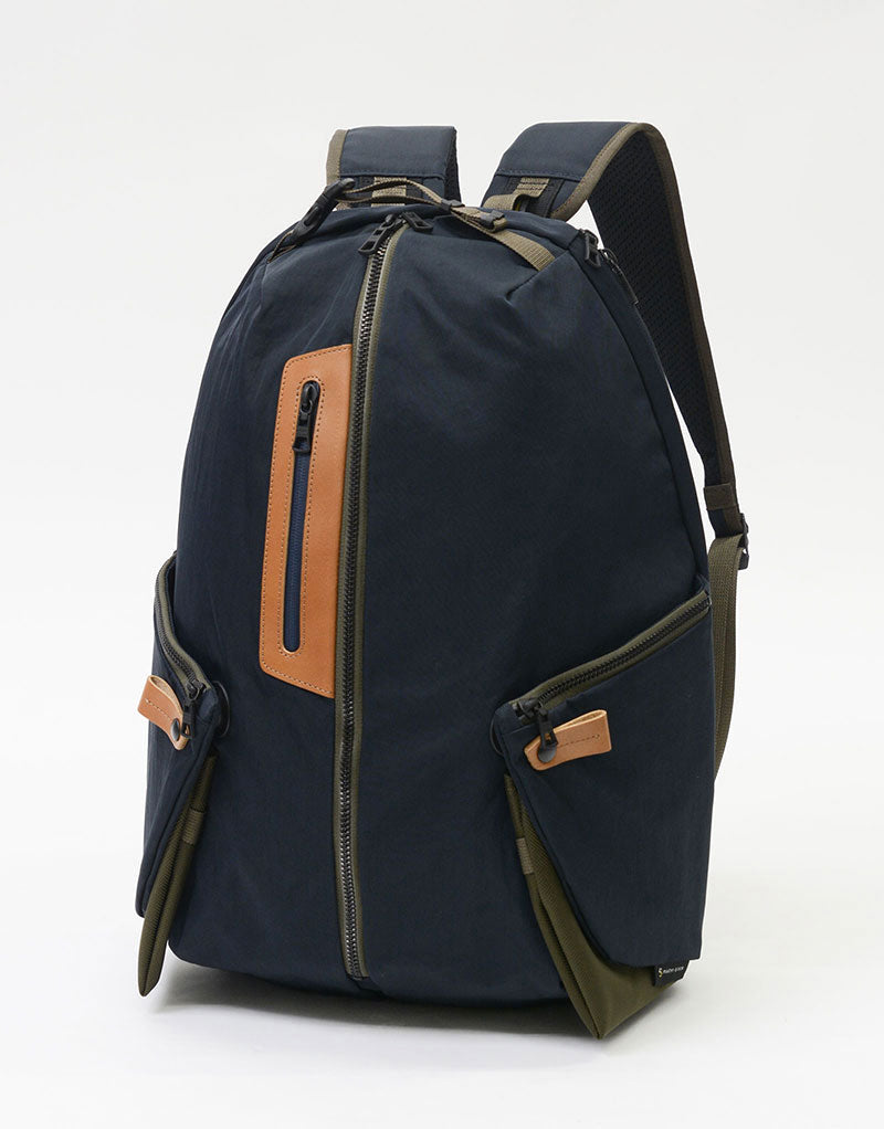 This item combines functionality and design, including a jet-dyed material, the original "m-strap" mechanism that reduces the load on the body, and a storage area that can be easily opened and closed by using magnetic functional parts.