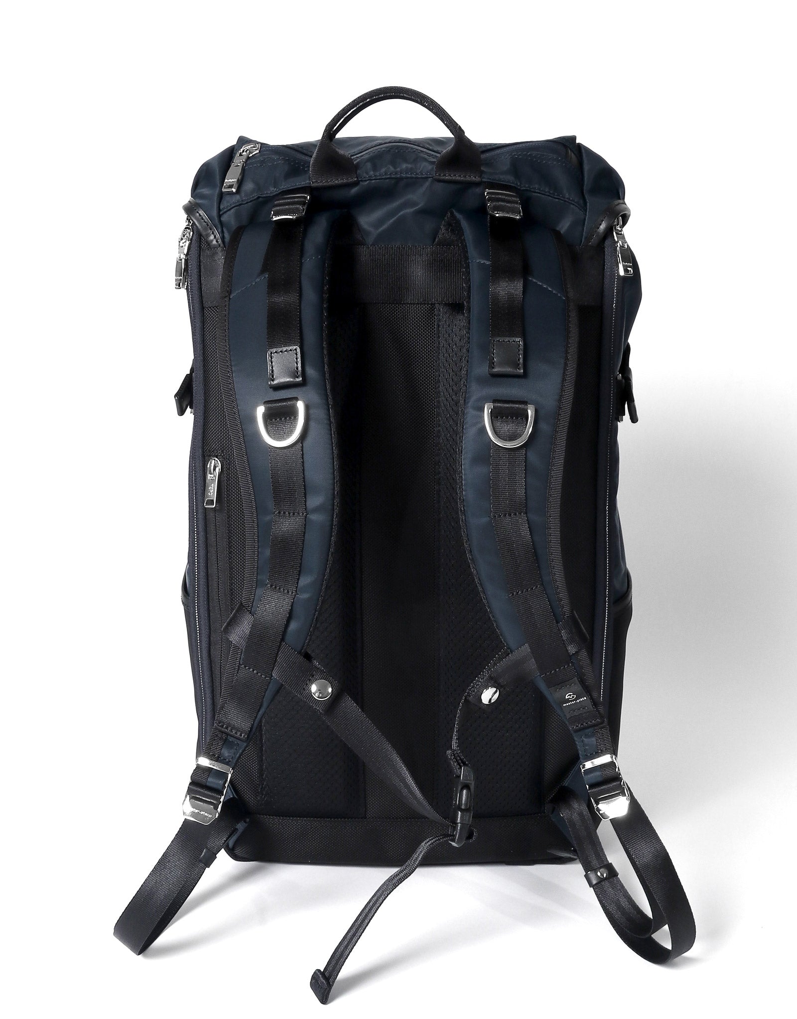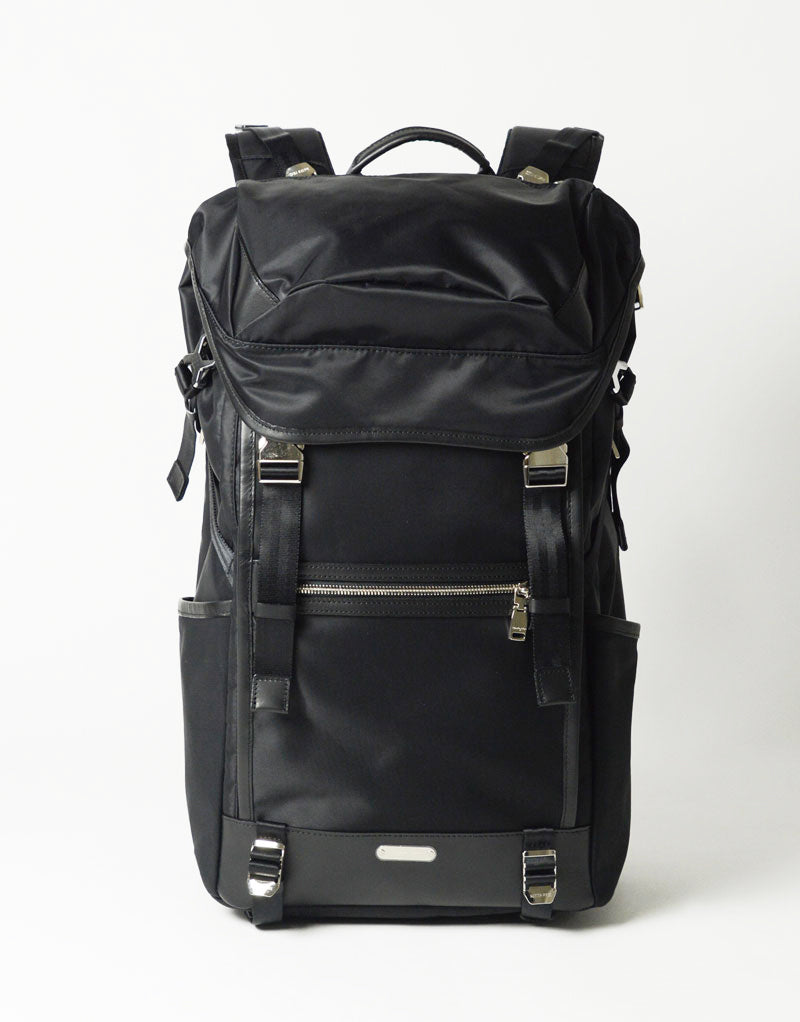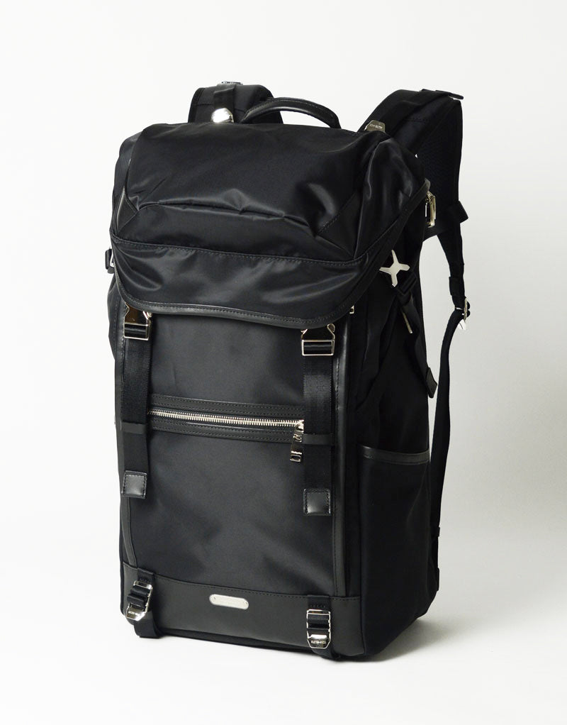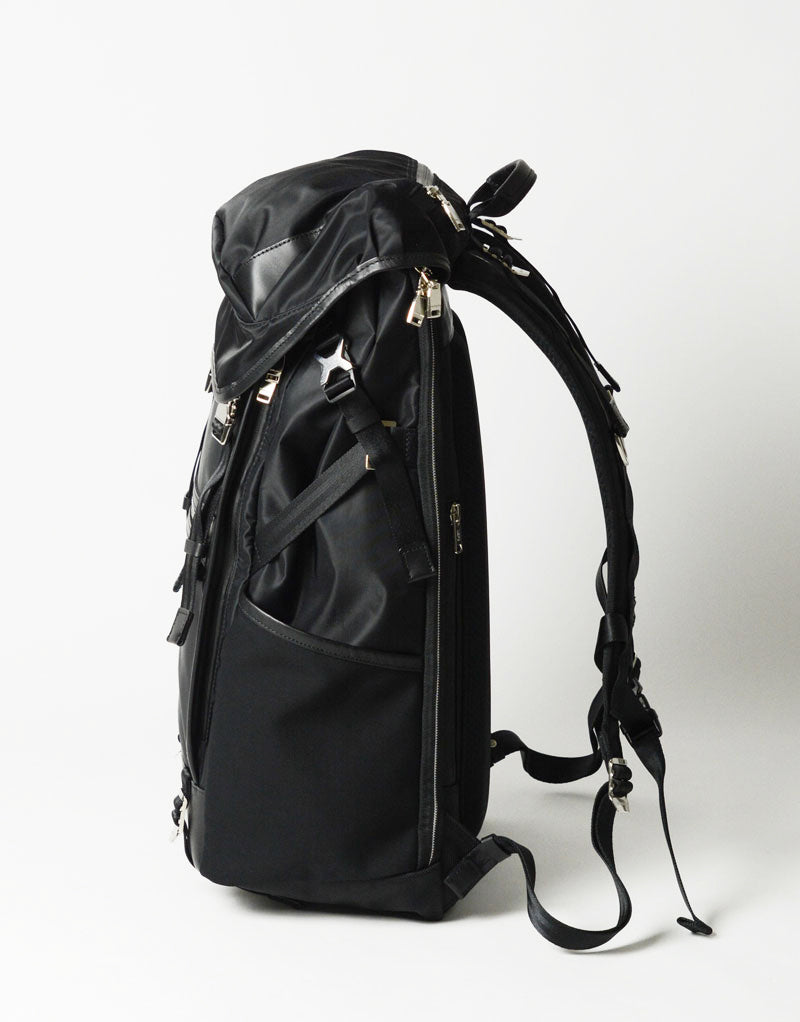 The high-density nylon body carries a lustrous sheen reminiscent of a flight jacket, while metal buckles and EXCELLA zippers lend it a rugged yet refined character.