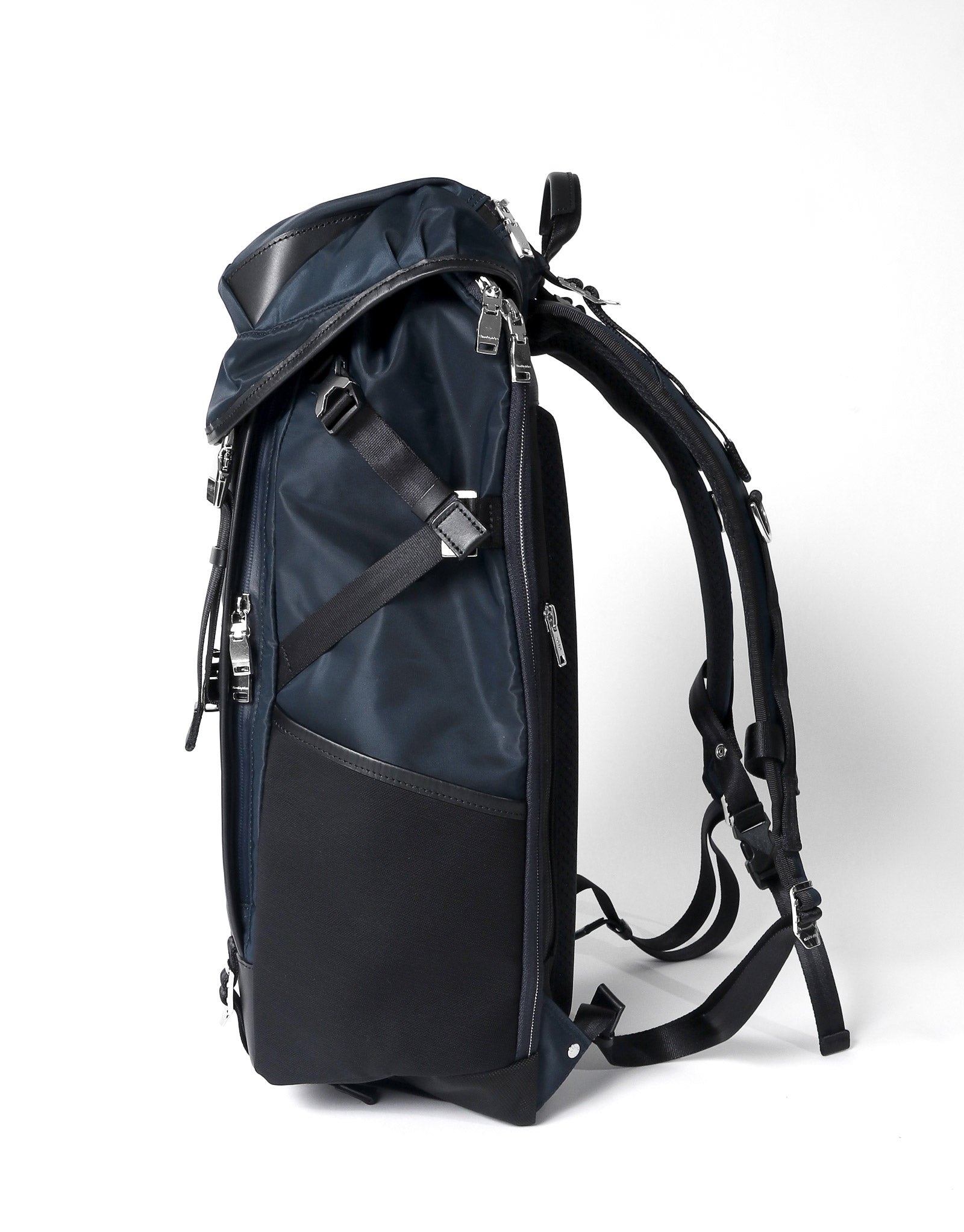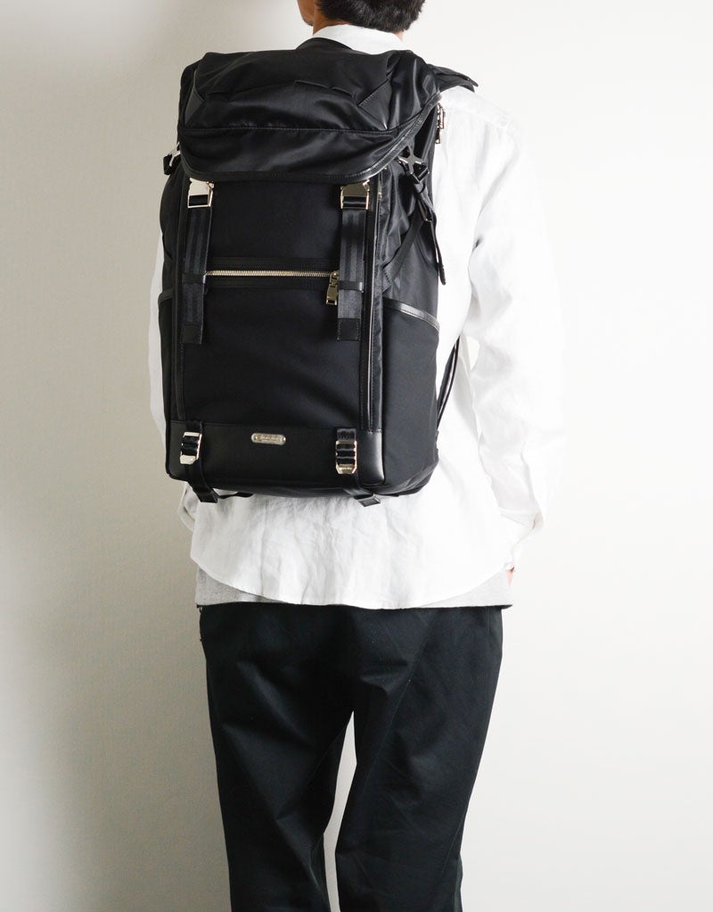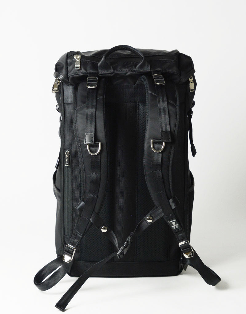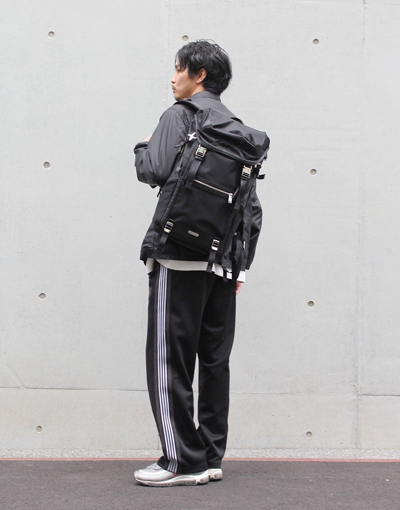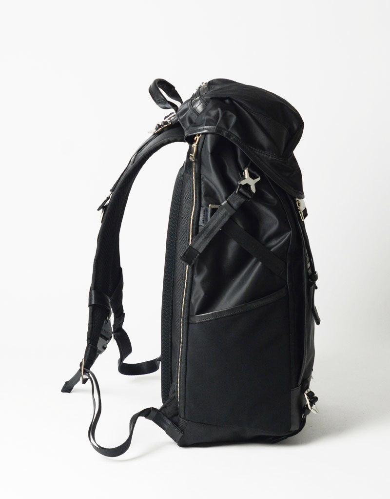 The high-density nylon body carries a lustrous sheen reminiscent of a flight jacket, while metal buckles and EXCELLA zippers lend it a rugged yet refined character.