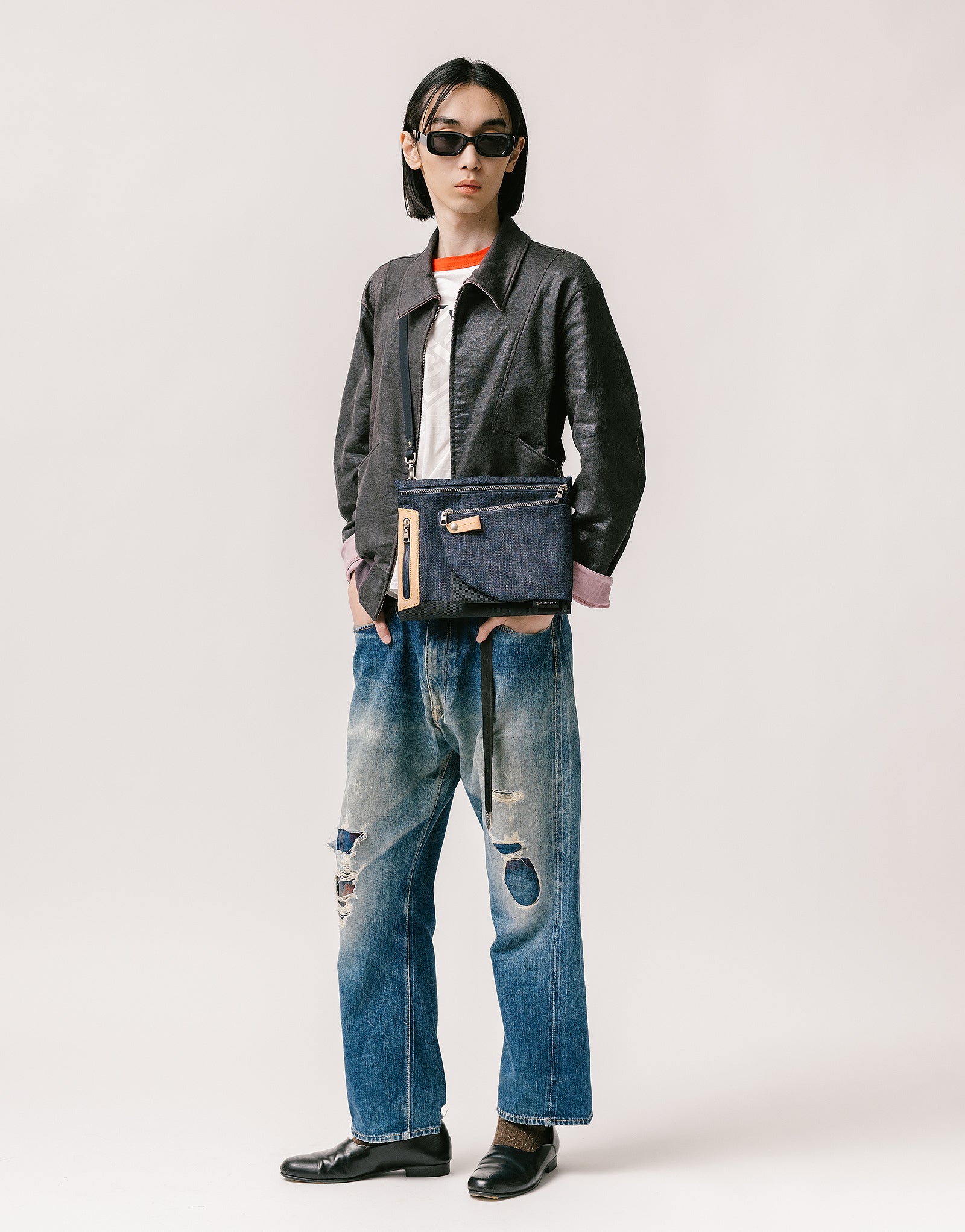 The main body material uses denim fabric called greige (unshrunk fabric) made on old-style looms, realizing the elasticity, resilience, and texture that cotton naturally possesses. Therefore, due to the characteristics of the fabric, there may be slight variations depending on humidity and temperature during production. Because it uses indigo dye, color may transfer or fade due to contact or friction with other objects. Also, since no water-repellent treatment is applied, please be careful to avoid getting it wet as much as possible.