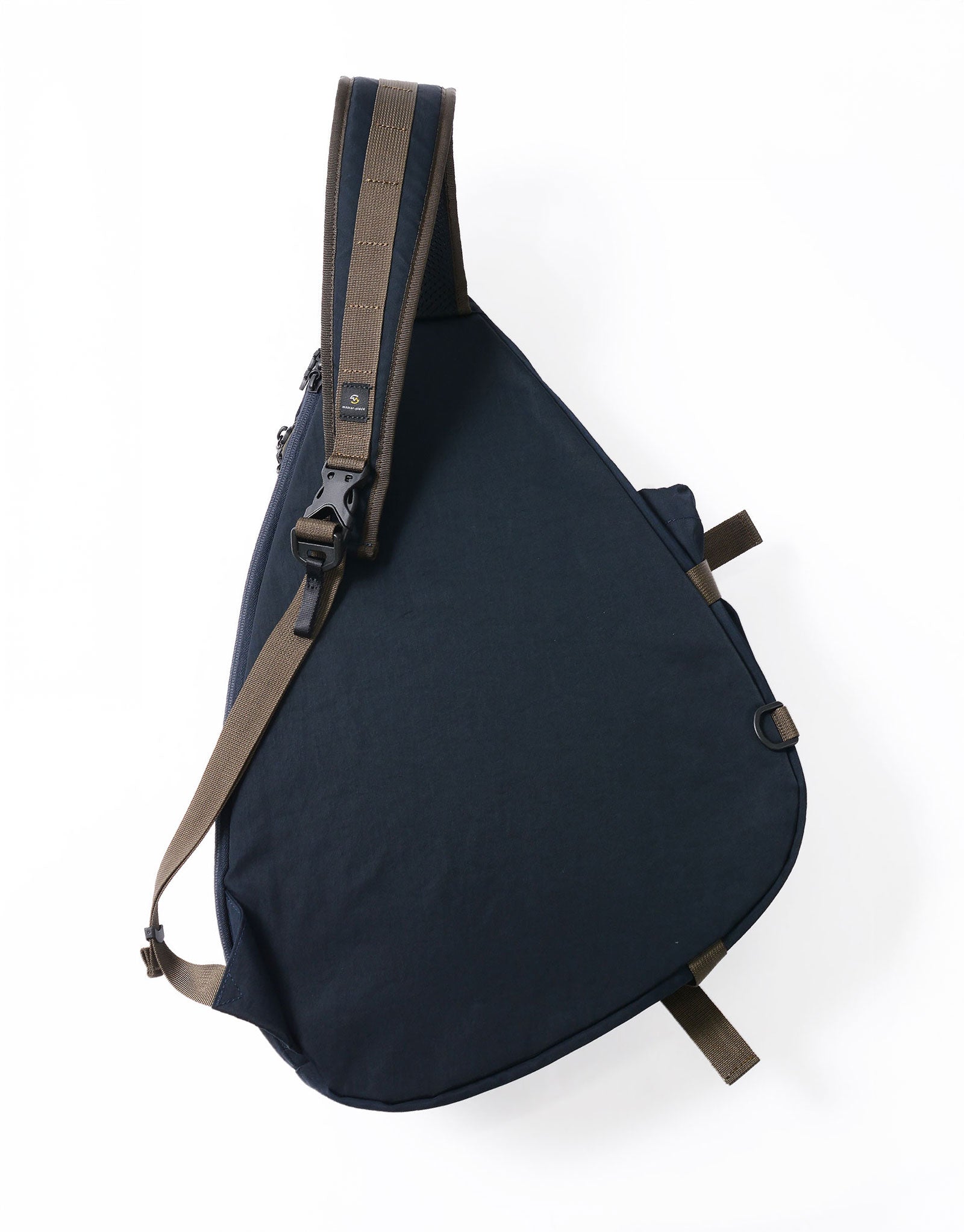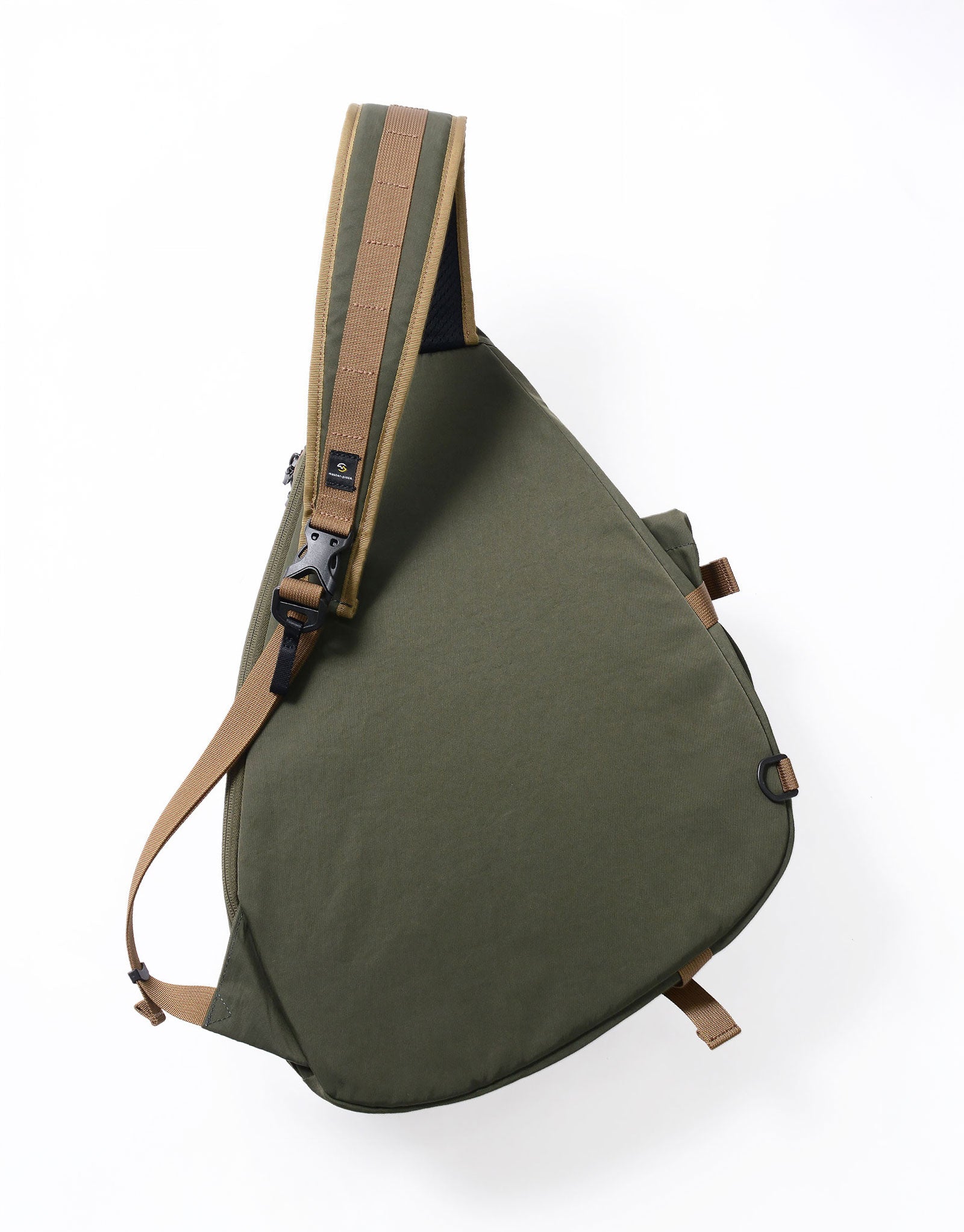 The main body material is Japanese nylon twill using 110d warp and 210d weft yarn, lightweight yet tightly woven. Jet dyeing (also called liquid flow dyeing, a method where fabric is dyed while riding on the flow of dye sprayed from nozzles) creates a natural wrinkled texture and subdued luster. After dyeing, the fabric surface is treated with light water repellency.
