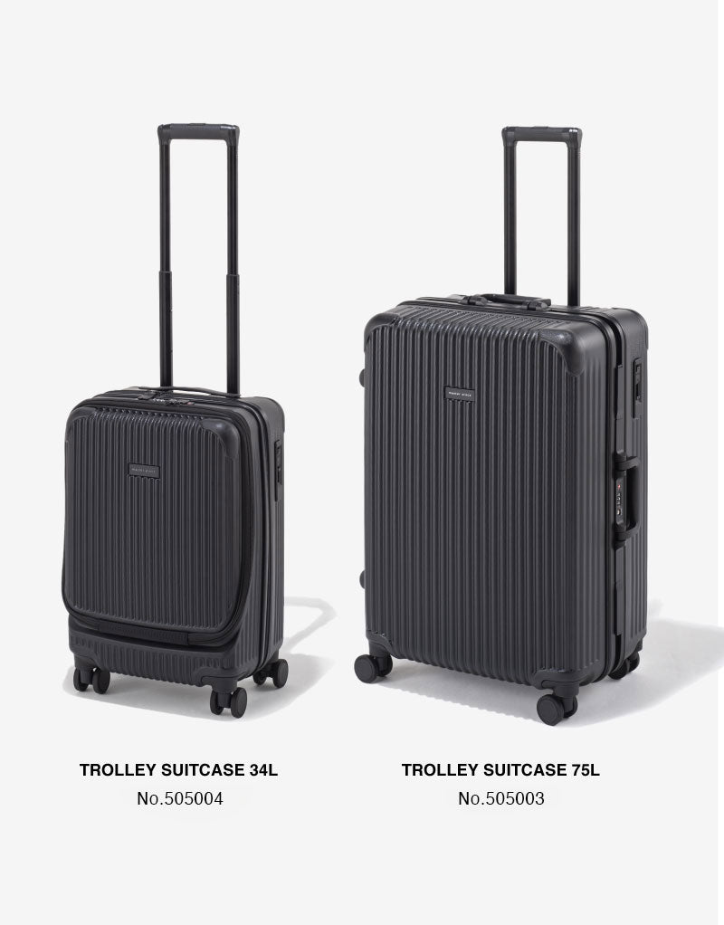 Standard equipped with TSA Lock (*) approved by the Transportation Security Administration. Features highly durable, maneuverable large 4-wheel double wheels manufactured by Hinomoto, ensuring mobility and quiet operation. Also equipped with an on/off function for the caster stopper, convenient for use on trains or inclined surfaces. The carry bar is adjustable to 3 lengths and uses handles with high grip comfort. The interior is equipped with cross belts and a removable divider panel. Can be used as a wall pocket during travel.