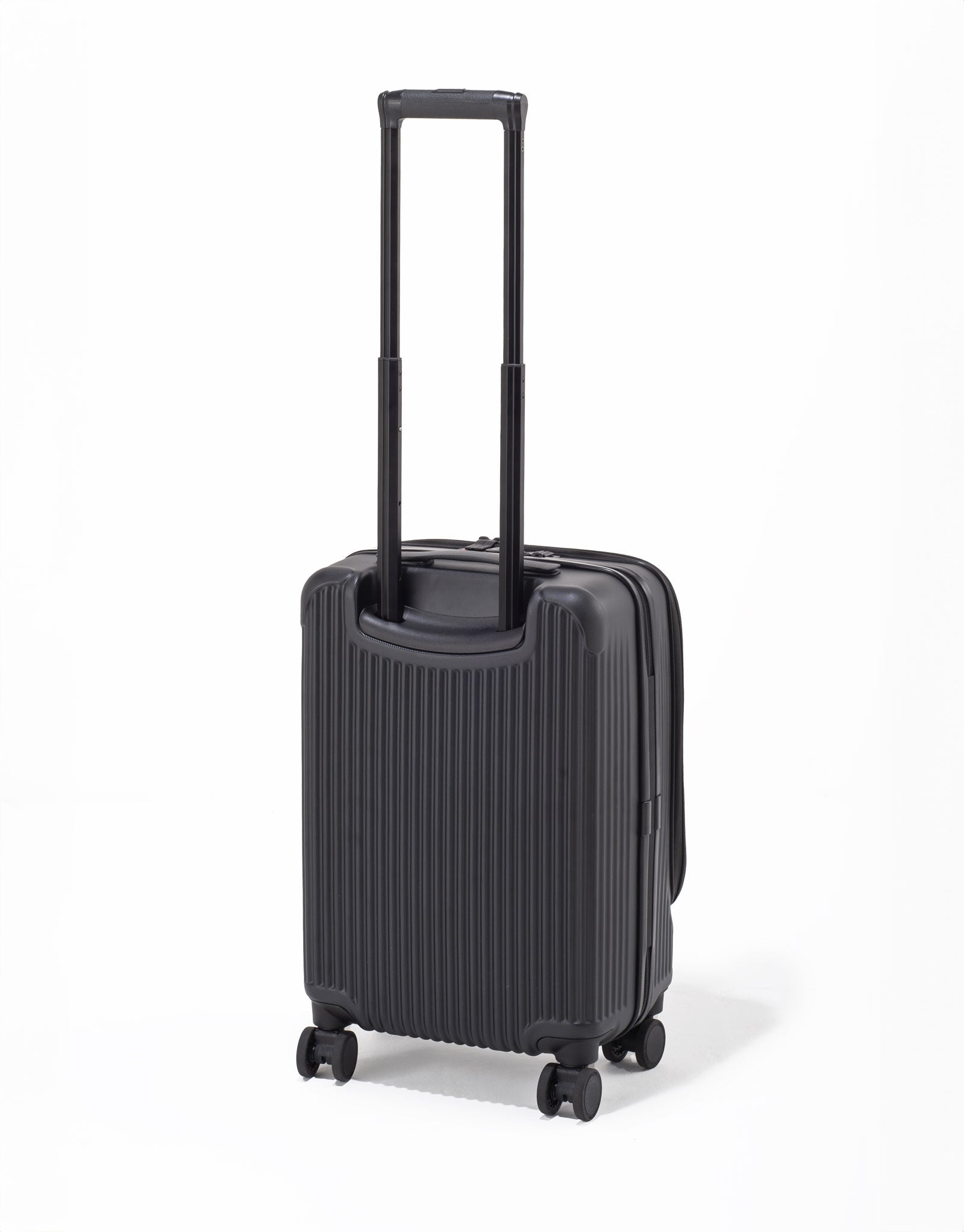 The main body material is a hard case using polycarbonate blend resin with high physical properties including impact resistance, heat resistance, and flame retardancy, finished with a textured surface that makes scratches less noticeable. The body features vertically arranged wave-shaped ribs that not only provide a stylish appearance but also enhance strength. Additionally, the upper corners are integrally molded with bulges to increase corner strength while reducing friction on the body.