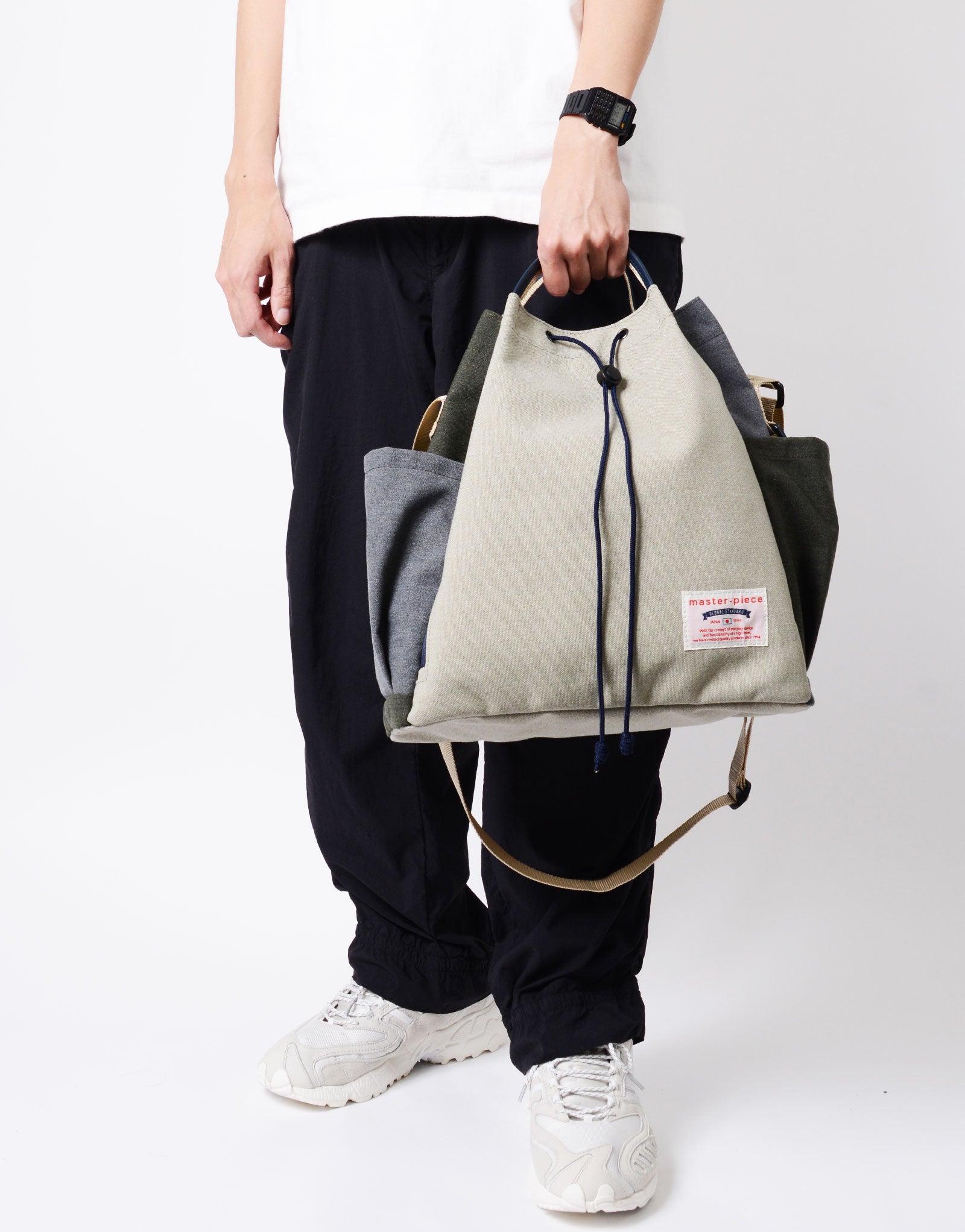 Available in three colors: Beige, Khaki, and Black. Beige and Khaki feature an asymmetrical color scheme that adds subtle character while maintaining a calm impression. The design is well-balanced and easy to adopt as a unisex item.