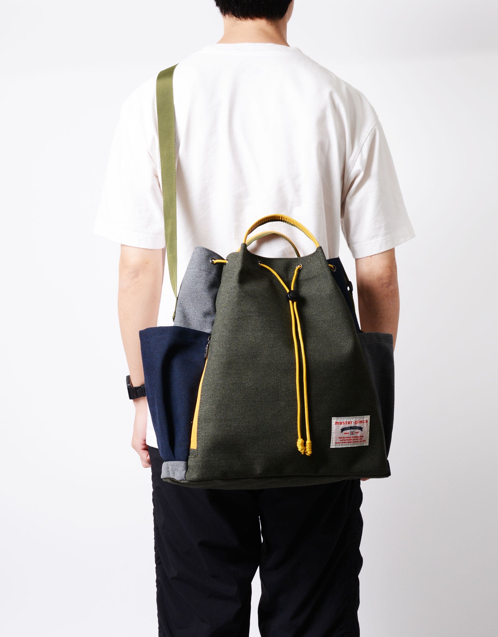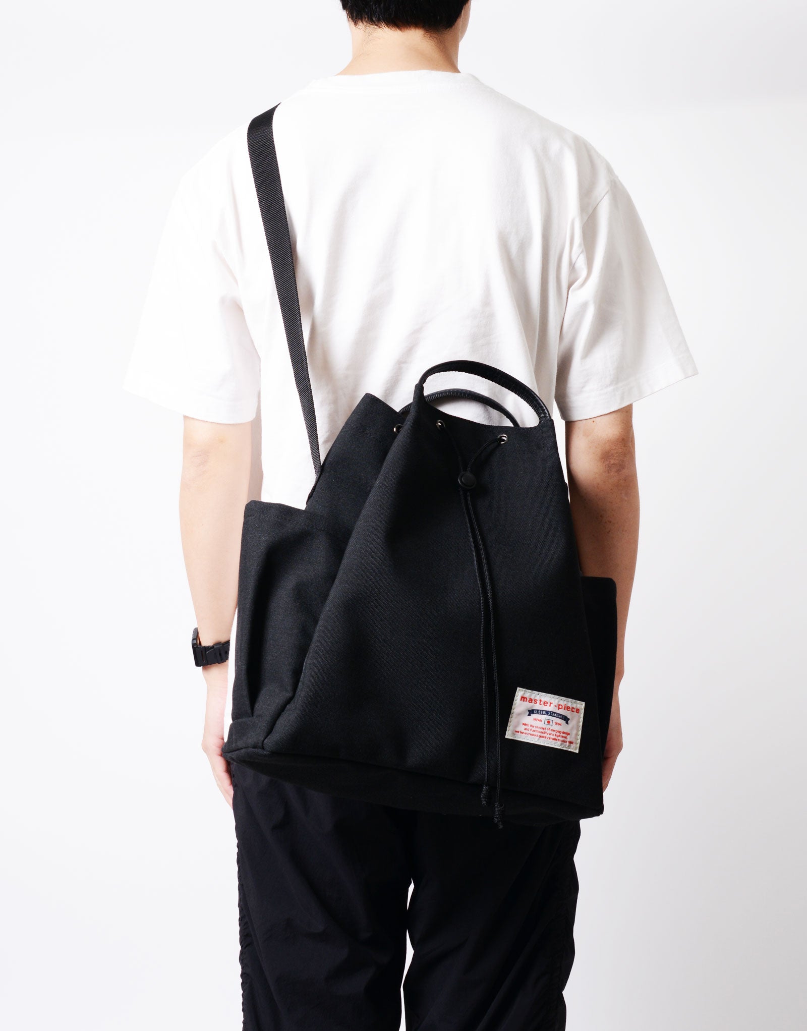 This bag is made with environmentally conscious GRS-certified recycled polyester as its main material, and features a versatile 2-way design that can be used both as a drawstring bag and a tote.